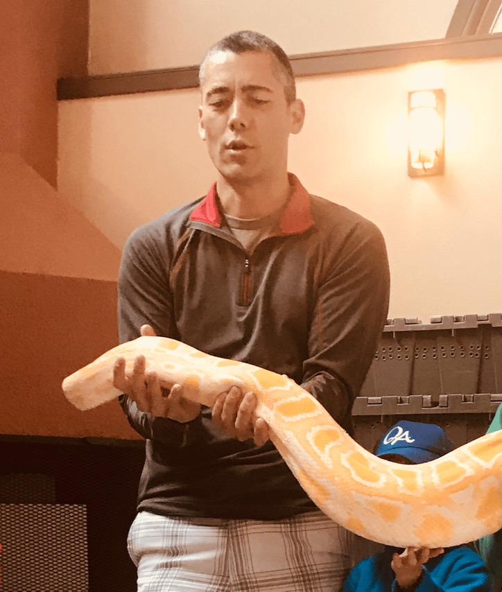 My husband holding the head of a Python courtesy of The Reptile Man